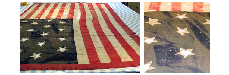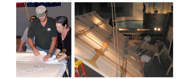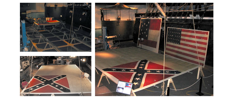 The huge size of these Civil War Naval flags made on site treatment necessary. Support frames were built and covered with fabric. The flags were hand stitched to the mounts.