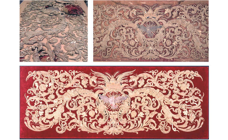 The silk velvet backing on this 18th c. antependium (raised metallic embroidered alter frontal) had rotted and torn over time. The embroidery was unstitched. A new mount was covered with canvas and new silk velvet material. The metallic embroidery was cleaned and hand stitched to the mount.