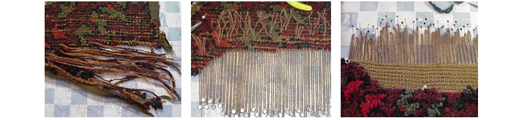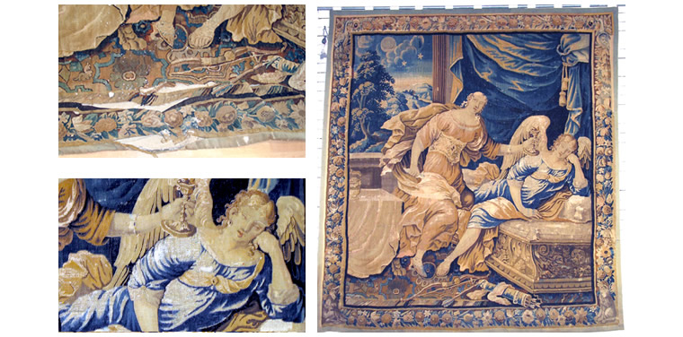 Torn areas in the border of this 19th c. wool and silk tapestry were rewoven. A new linen backing and Velcro strip for hanging were stitched to the tapestry.