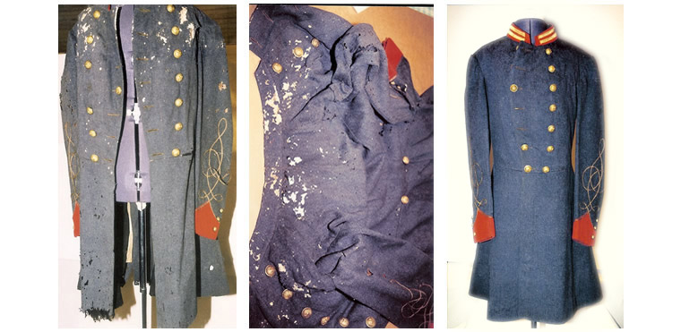 This Civil War Confederate artillery officer’s frock coat was badly moth damaged. New wool material was dyed to match and used to underlay the damaged areas. Holes were hand stitched to the support material to stabilize the damage.