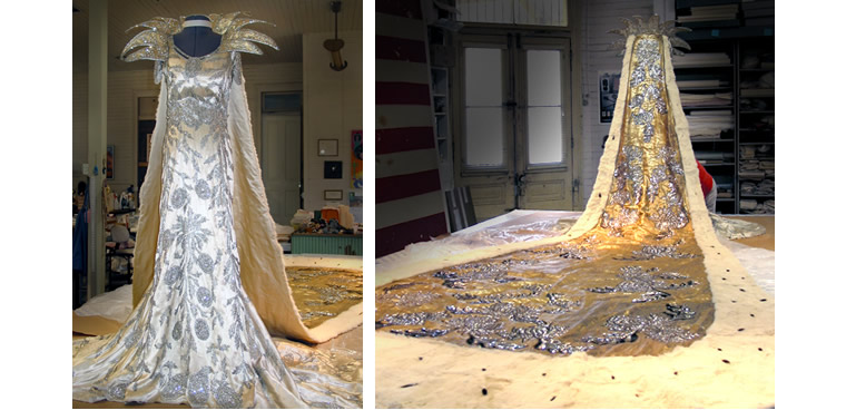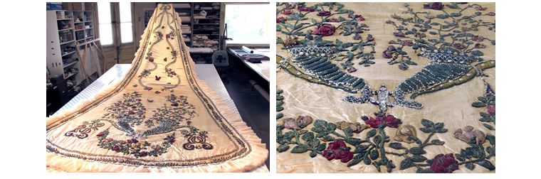 Historic Carnival costumes including queen's gowns and mantles are cleaned and conserved before exhibition.