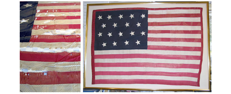 The shattered silk bars were heat fused to a support fabric to stabilize the damage on this 18 star flag c. 1812. The light damaged areas on the dark blue cotton canton were color enhanced. The flag was hand stitched to a mount and framed.