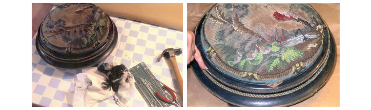 This fire damaged 19th c. beaded footstool was cleaned to remove surface soot.