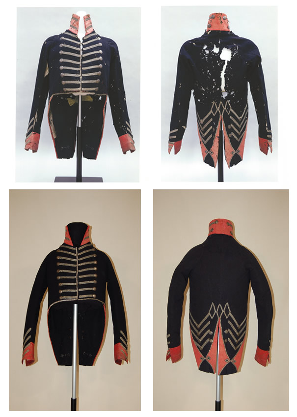 Over 500 hours were spent in the conservation of this rare officer's coatee, worn during the War of 1812. Underlays of new custom dyed wool materials were hand stitched into the coat to support and stabilize the moth damaged areas.