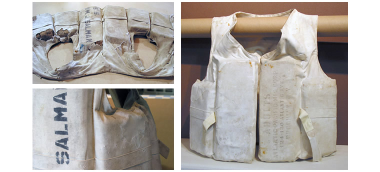 Damage to the outer covering of this cork lined WW II life vest was stabilized with insets of cotton material fused to the vest.