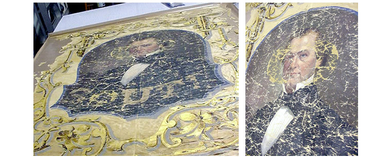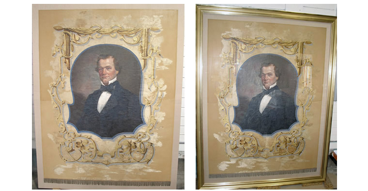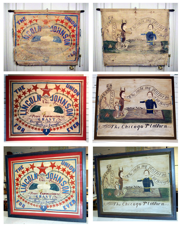 After dis-assembly, each side of this double faced 1864 presidential campaign banner was stabilized separately. The fabric panels were relined, the paintings were restored, and both banners were framed in a double faced frame.