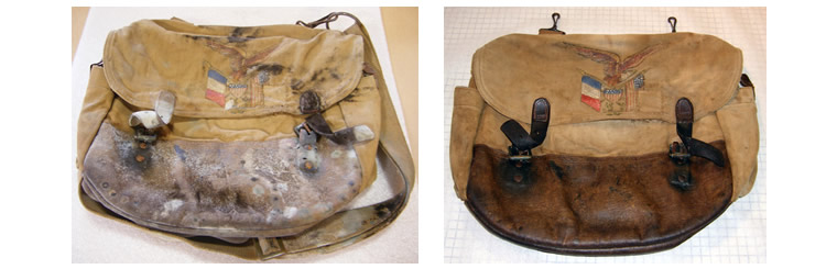 This WWII map satchel was damaged by water flooding its display case. Mold was removed from the leather, which was then cleaned and treated with leather dressing. The canvas bag was cleaned to remove mold and dirt.