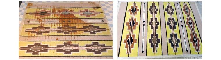 The wool Navajo carpet was rust stained after flooding. The rust was removed, and the carpet was wet cleaned.