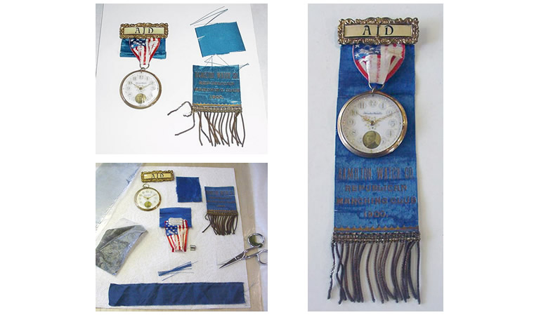 This political silk watch ribbon was torn into three pieces. After cleaning, the ribbon was reassembled and fused to a silk underlayer.