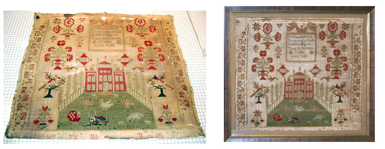This early schoolgirl sampler was cleaned and stitched to a new linen backing to stabilize the damaged areas before mounting and framing.