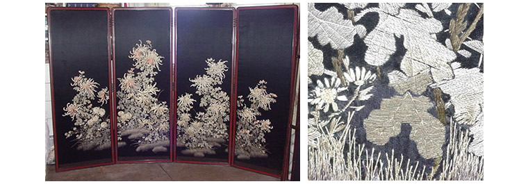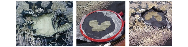 A large hole was torn in this Chinese silk embroidered screen. A patch was embroidered to replicate the missing area. It was inset and further embroidered to integrate the patch into the panel.