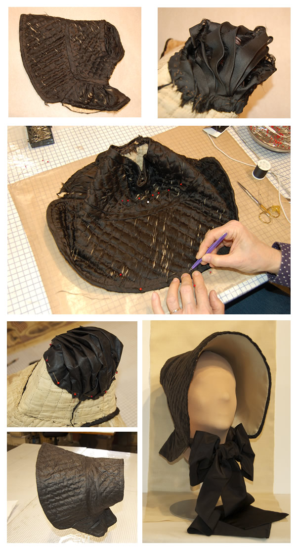 This bonnet, worn by Lincoln assassination conspirator Mary Surratt, was stabilized by heat seal consolidation, and mounted for exhibition.